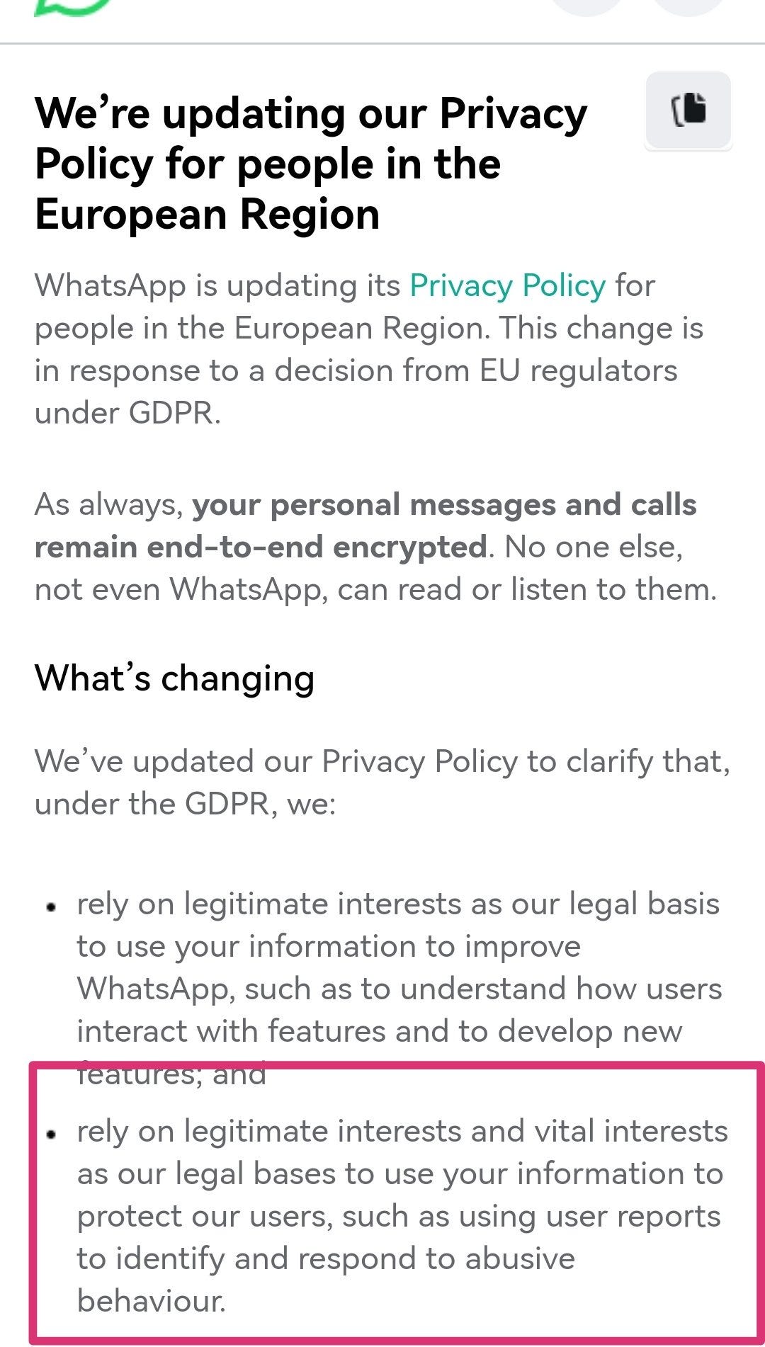 Dupa cum va spuneam saptamana trecuta, a intrat in vigoare Digital Services Act, adoptata de insitutiile UE, fara votul populatiei, ca de obicei. Nu stau sa detaliez, dar este o cretinatate limitatoare de libertati, care impune cenzura si politia adevarului pe retelele sociale si multe altele. Ca exemplu, cei de la WhatsApp au facut schimbarea de mai jos in regulament.
