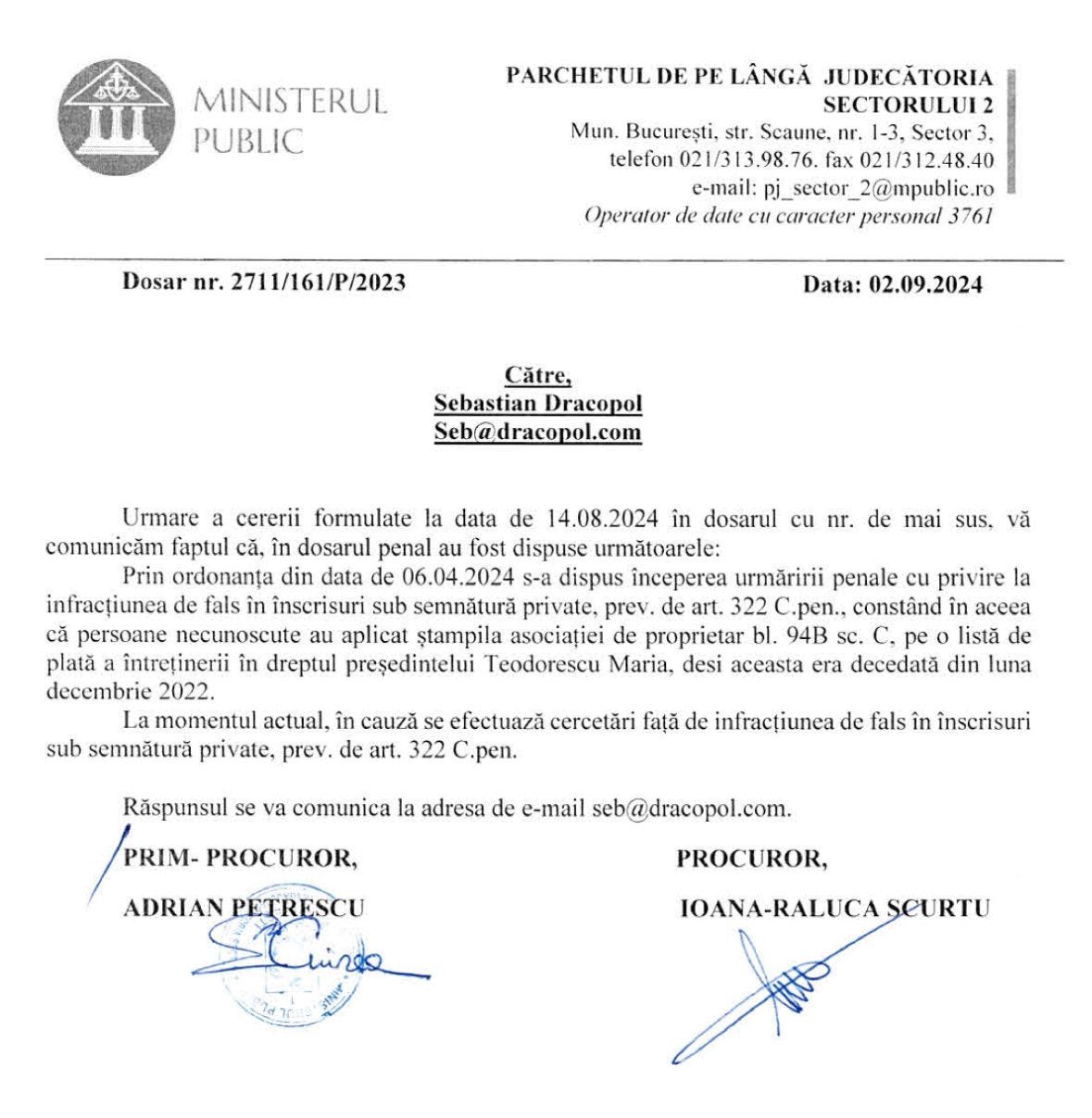 Asa ca am dat frumos mail la Parchetul de pe langa Judecatoria Sectorului 2. Le-am descris situatia, am atasat si o copie dupa CI, sa nu zica ca-s vreun nebun si copii dupa intretinerea cu pricina. E tot ce trebuie sa faceti.