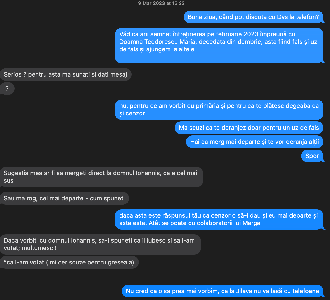 Si serios, chiar nu sunt bulangiu, nu m-am repezit la optiunea nucleara, am dat mailuri la administrator si am incercat sa discut cu cenzorul, Pavel Varvari, de la Xisoft SRL. Ca semnase si el intretinerea aia, odata cu decedata. Care asta mi-a zis (el scrie cu negru eu cu albastru):
