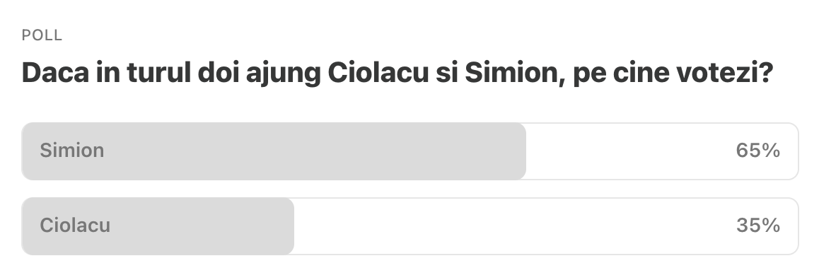 La noi, ce sa va mai zic ca stiti. Mi s-a parut interesant rezultatului sondajului pus de mine vineri in Retrospectiva Saptamanii, unde am intrebat cititorii pe cine aleg intre Simion si Ciolacu: