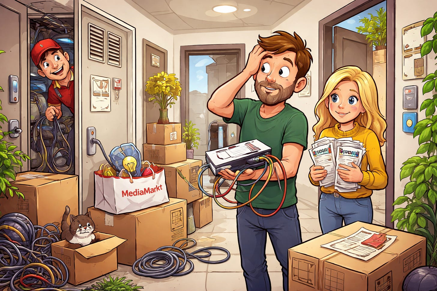 Este foarte mult de povestit, așa că o să împart povestea mutării noastre în mai multe episoade. Deocamdată o să tratez cum ne-am pus internetul și curentul electric aici. Pentru că aici, când pleacă cineva dintr-un apartament, își ia abonamentele cu el: la internet, la curent electric, la încălzire dacă se poate, emigrează totul cu el. În fine, puteau să nu ia și mufele de la cabluri, dar ajungem și acolo.