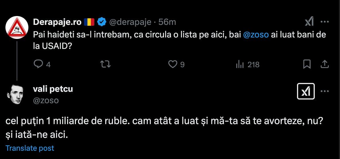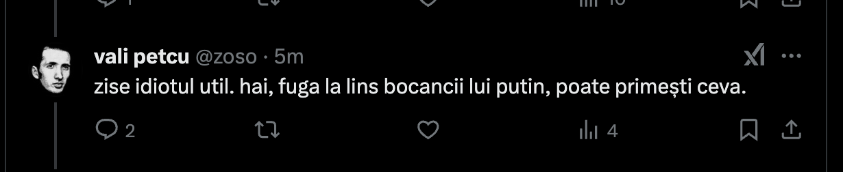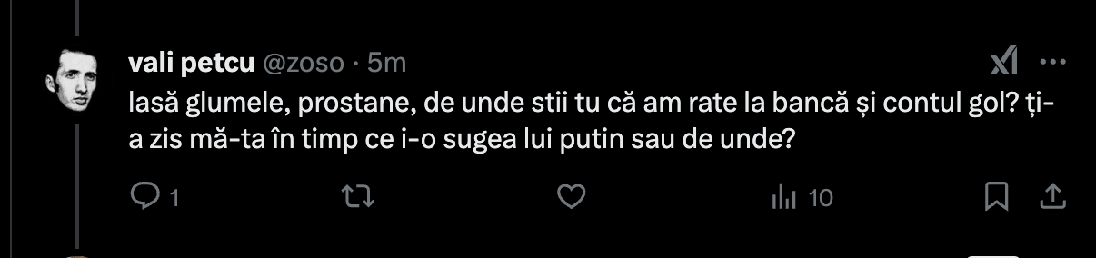 Doar ca apropo de influenceri platiti si spalati pe creier si cu replicile de NAFO la ei, pe lista aia era si Vali Petcu, cunoscut ca si Zoso, cel mai vechi blogger roman pe hate. Eu sunt porumbelul pacii pe langa asta. Asa ca ieri dimineata i-am dat o intrebare pe X sa vad ce zice de problema, la care a reactionat urat de tot:
